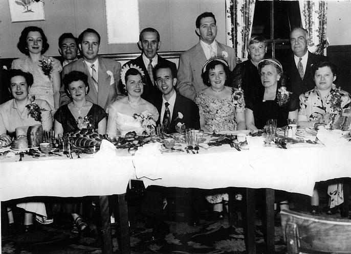 | Wedding Day: Marilyn and Lester Reisch, 1951 Standing: Roslyn Kaplan, Milton Weintraub, Fred Reisch, Morris Reisch, Fred Kasendorf, Anna Weintraub and husband Sol Seated: Bernice Kaplan, Esther Reisch, Marilyn Reisch, Lester Reisch, Laurel Kasendorf, Rose Reisch, Gertrude Kaplan |